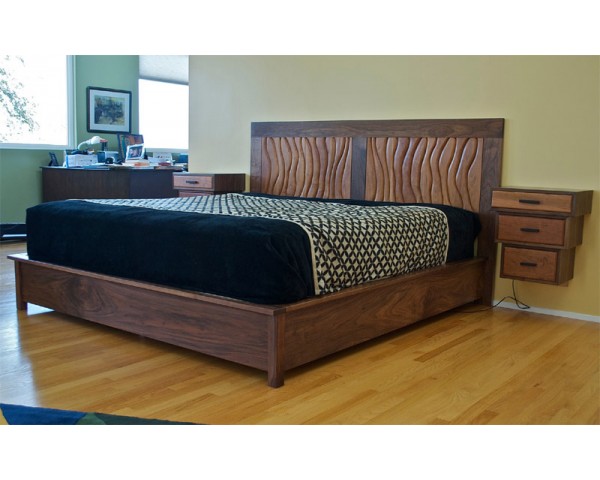Kings size walnut and cherry bed with sculpted headboard and floating night stands.