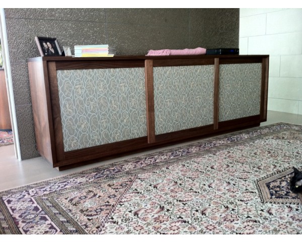shoe cabinet- walnut case with pattern upholstery door panels-96"x19"x30"